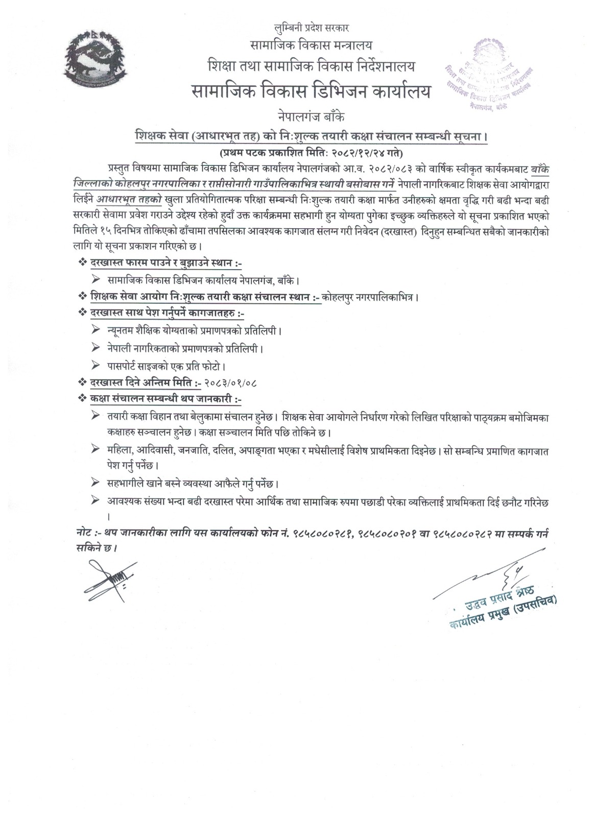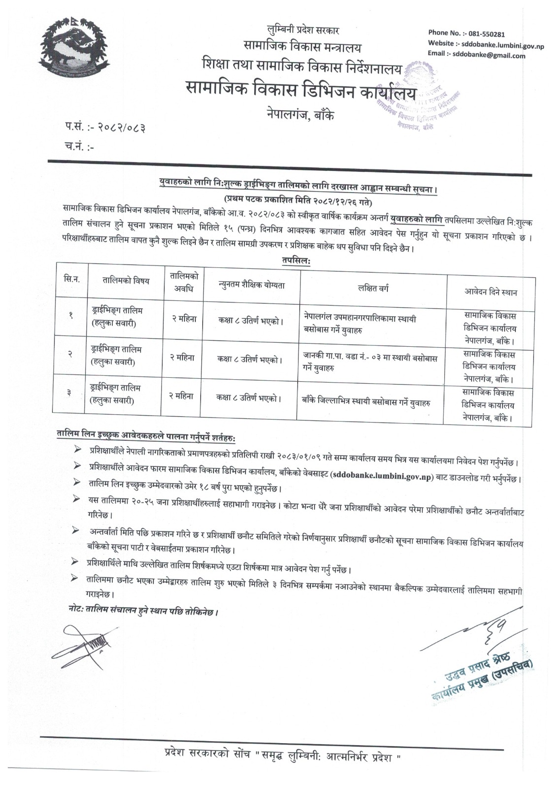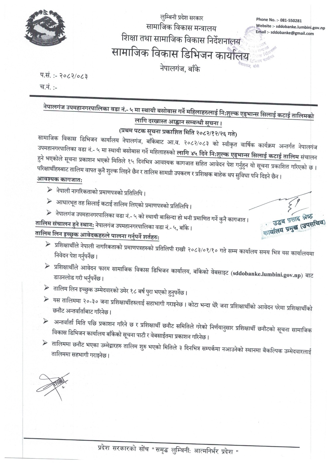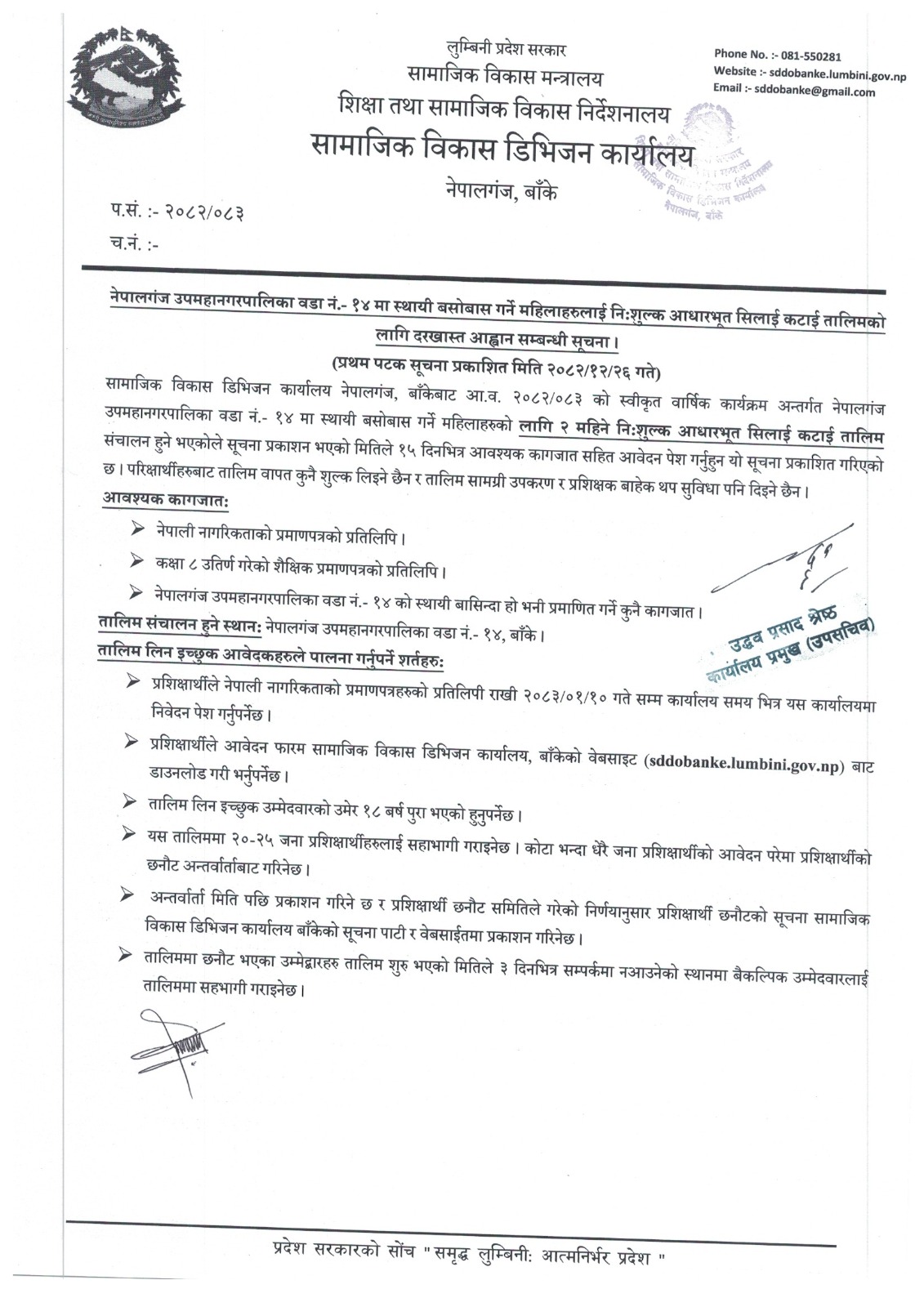 हाल मुलुकमा संघ, प्रदेश र स्थानीय गरी ३ तहको सरकार रहेका छन् । लुम्बिनी प्रदेशको प्रदेश सरकार अन्तर्गत सामाजिक विकास मन्त्रालय रहेको छ । प्रदेश सरकार, मन्त्रिपरिषदको मिति २०७६ साल कार्तिक १८ गतेको निर्णयानुसार शिक्षा, श्रम तथा रोजगार, युवा तथा खेलकुद, विज्ञान तथा प्रविधि र सामाजिक विकास तर्फका जिल्ला तथा स्थानीय स्तरमा सञ्चालन हुने कार्यक्रमहरुको सञ्चालन तथा कार्यान्वयनका लागि सामाजिक विकास मन्त्रालय, शिक्षा तथा सामाजिक विकास निर्देशनालय अन्तर्गत रहने गरी प्रदेश भित्र स्थापित ६ वटा सामाजिक विकास डिभिजन कार्यालयहरु मध्ये यस सामाजिक विकास डिभिजन कार्यालय नेपालगंज बाँकेको स्थापना भएको हो । यस डिभिजन कार्यालयको कार्यक्षेत्र बाँके र बर्दिया जिल्ला रहेको छ । यस डिभिजन कार्यालयको विधिवत उद्घाटन मिति २०७६ साल मंसिर १० गतेका दिन सामाजिक विकास महाशाखा प्रमुख शारदा बस्यालज्यूबाट भएको हो। साविक ब्याबसायिक तथा सीप बिकास तालिम केन्द्र बाँकेको भवनमा यो कार्यालय स्थापना भई सञ्चालनमा रहेको छ । प्रदेश सरकारको सामाजिक विकास मन्त्रालय तथा शिक्षा तथा सामाजिक विकास निर्देशनालयको मातहतमा रही तोकिए लक्ष्यहरु प्राप्तिका निम्ति कार्य गर्नु यस कार्यालयको मुख्य जिम्मेवारी हो । प्रदेश सरकारको निर्णय बमोजिम साविकको व्यावसायिक तथा सीप विकास तालिम केन्द बाँके समेत यसै कार्यालयमा समायोजन भएको छ । कार्यालय मार्फत मुलुक र यस क्षेत्रमा व्याप्त गरिबी र बेरोजगारी समस्याहरुलाई समाधान गर्ने अभिप्रायले छोटो तथा मध्यमकालीन ब्यवसायिक एवं सीपमूलक आधारभुत तथा अपग्रेड तालीमहरु कटाई सिलाई, बिद्युत जडान, प्लम्बीङ्ग, केशश्रृगार, बेल्डीङ्ग, इलेक्ट्रोनिक्स मर्मत, कम्प्युटर, अटोमेकानिक्स र मोटरसाईकल मर्मत लगायतका विभिन्न तालिमहरु समेत नियमित रुपमा हुँदै आएको छन । साथै कार्यालयले प्राविधिक शिक्षा तथा व्यावसायिक तालिम केन्द्रको राष्ट्रिय सीप परीक्षण केन्द्रसंग सहकार्य गरी सीप सिकेका व्यक्तिहरुको सीप परीक्षण कार्य समेत गराउदै आएको छ ।