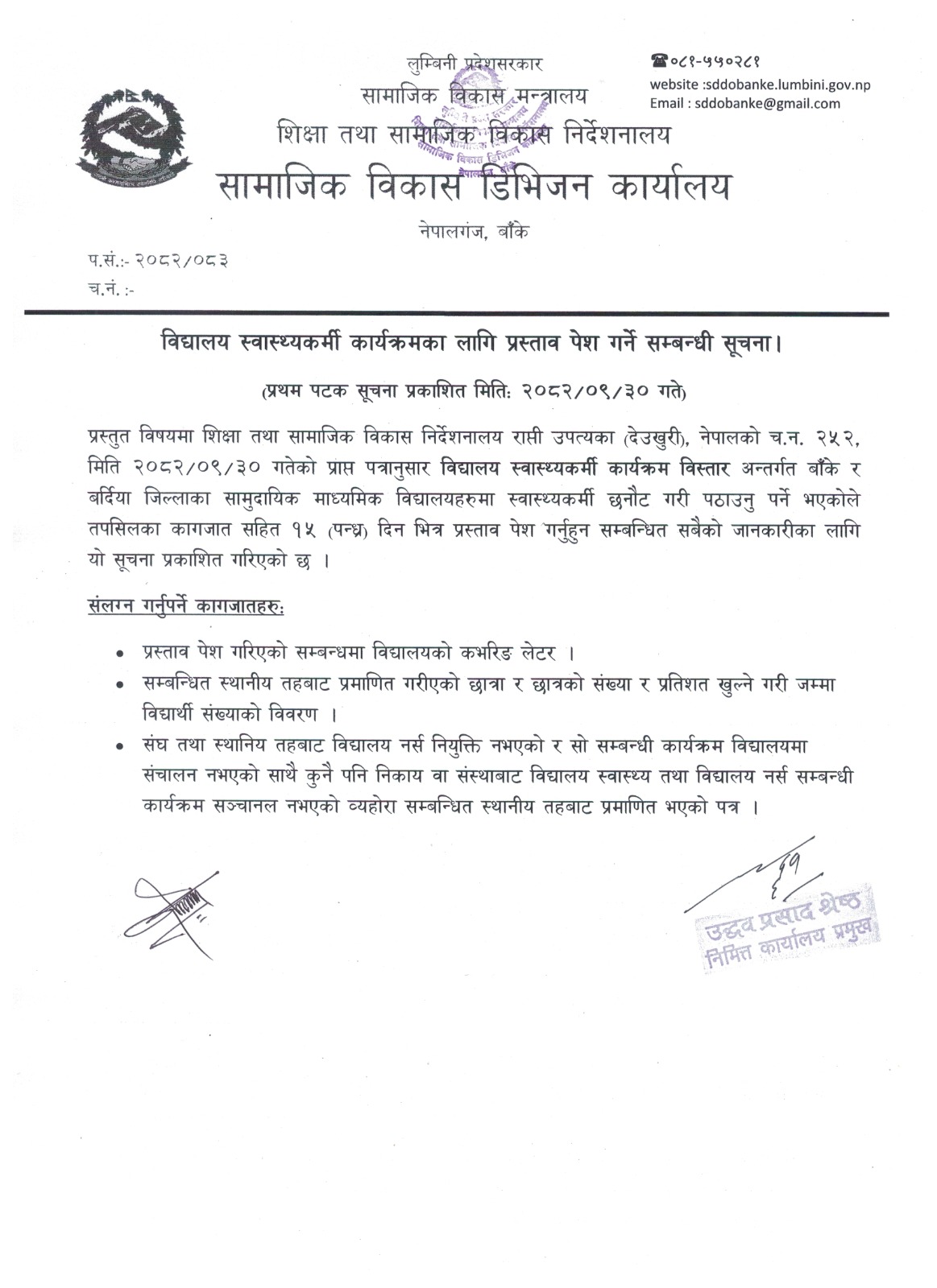 | 90 | विद्यालय स्वास्थ्यकर्मी कार्यक्रमका लागि प्रस्ताव पेश गर्ने सम्बन्धी सूचना । | सूचना तथा समाचारहरु | 2081-11-23 | View | Download |
