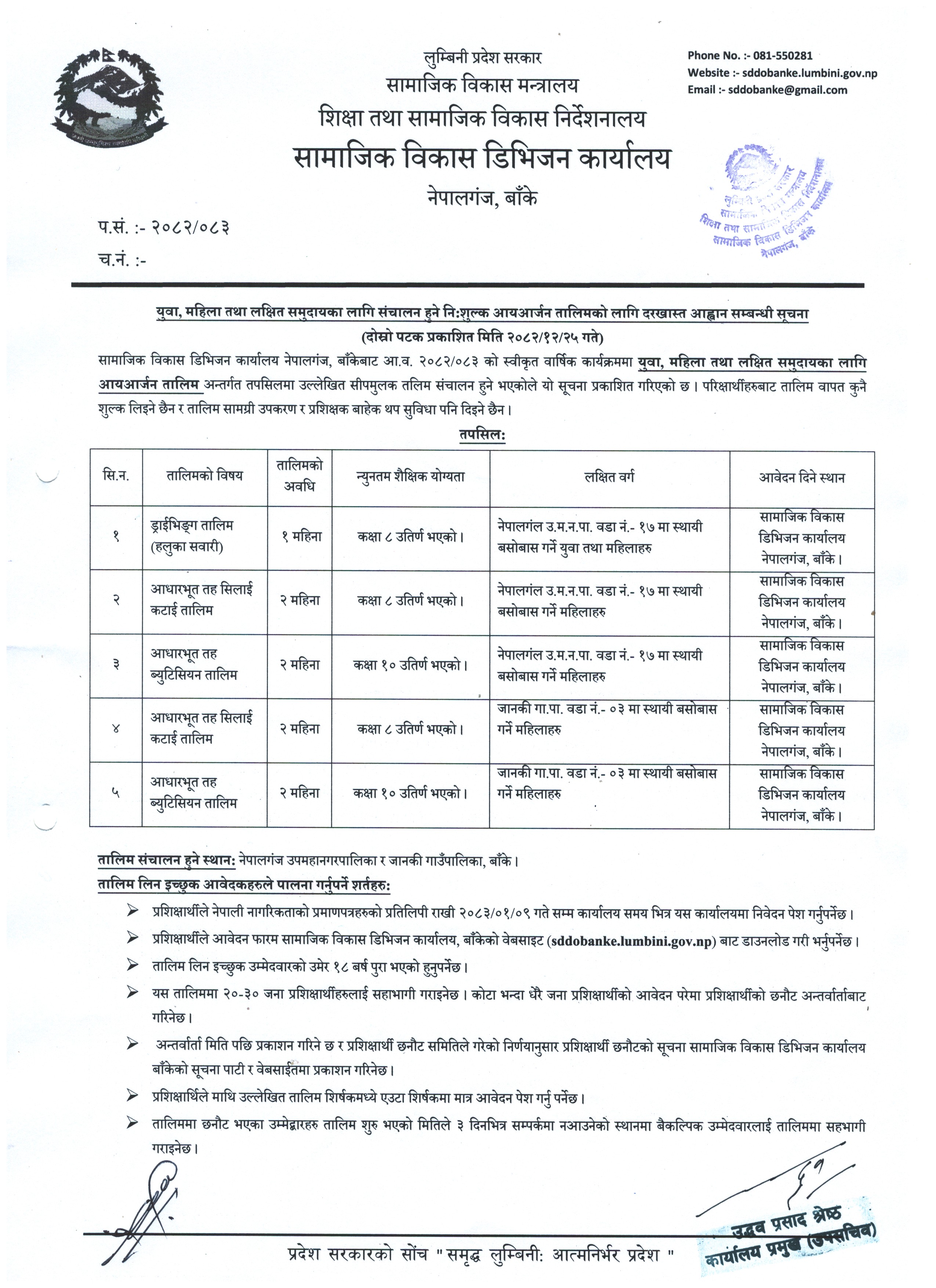 | 3 | नेपालगंज उ.म.न.पा. वडा नं. ५ मा स्थायी बसोबार गर्ने महिलाहरुको लागि नि:शुल्क आधारभूत सिलाई कटाई तालिमको दरखास्त आह्वान सम्बन्धी सूचना । | सूचना तथा समाचारहरु | 2082-12-26 | View | Download |